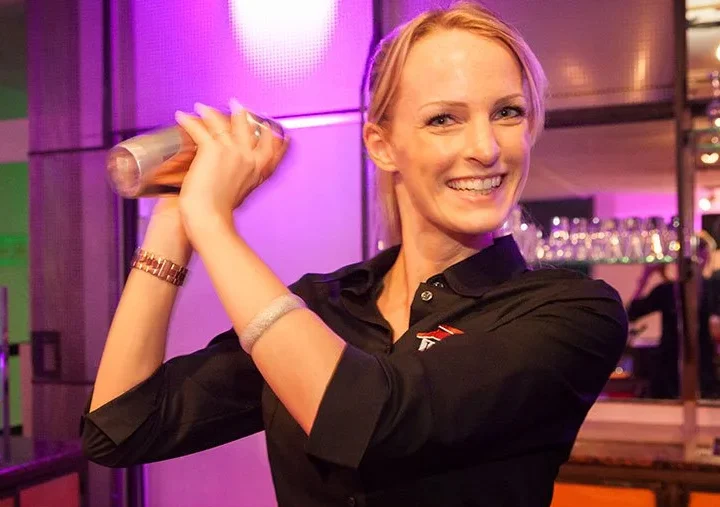 Mitarbeiterin von Tafelfreuden zapft Bier an der Theke in Köln und lächelt freundlich in die Kamera