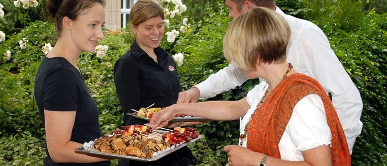 Servicekraft schenkt Sekt und Orangensaft in Gläser bei einem stilvollen Empfang von Tafelfreuden in Köln ein